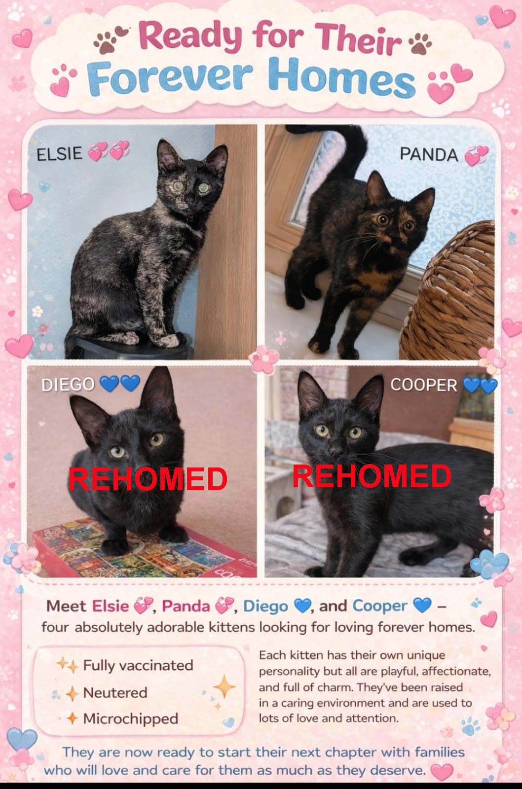 They are both happy little beans that hare around, love their food and are a very special bonded little pair!! These two kittens are now ready for their next adventure of a new home. A very secure garden or catio would be required as despite being on three legs they can move!!