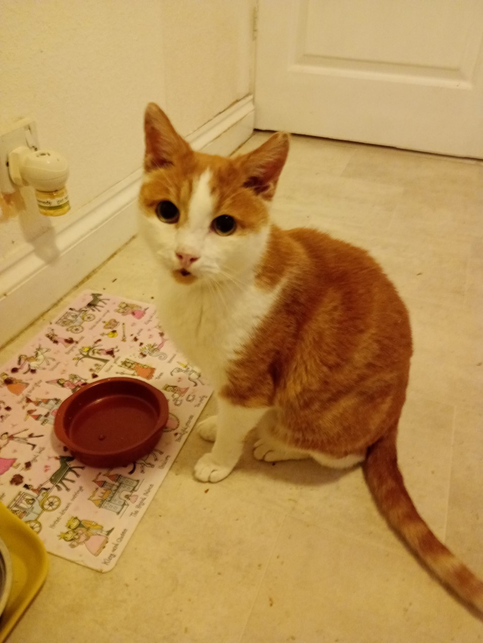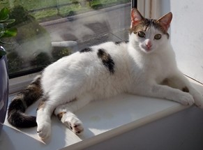 He is a friendly cat who likes to have company of a human. He is quite vocal and likes to talk to you. He will sit on your lap but only for as long as it suits him. He has a big appetite and will tell you in no uncertain terms when he is hungry.