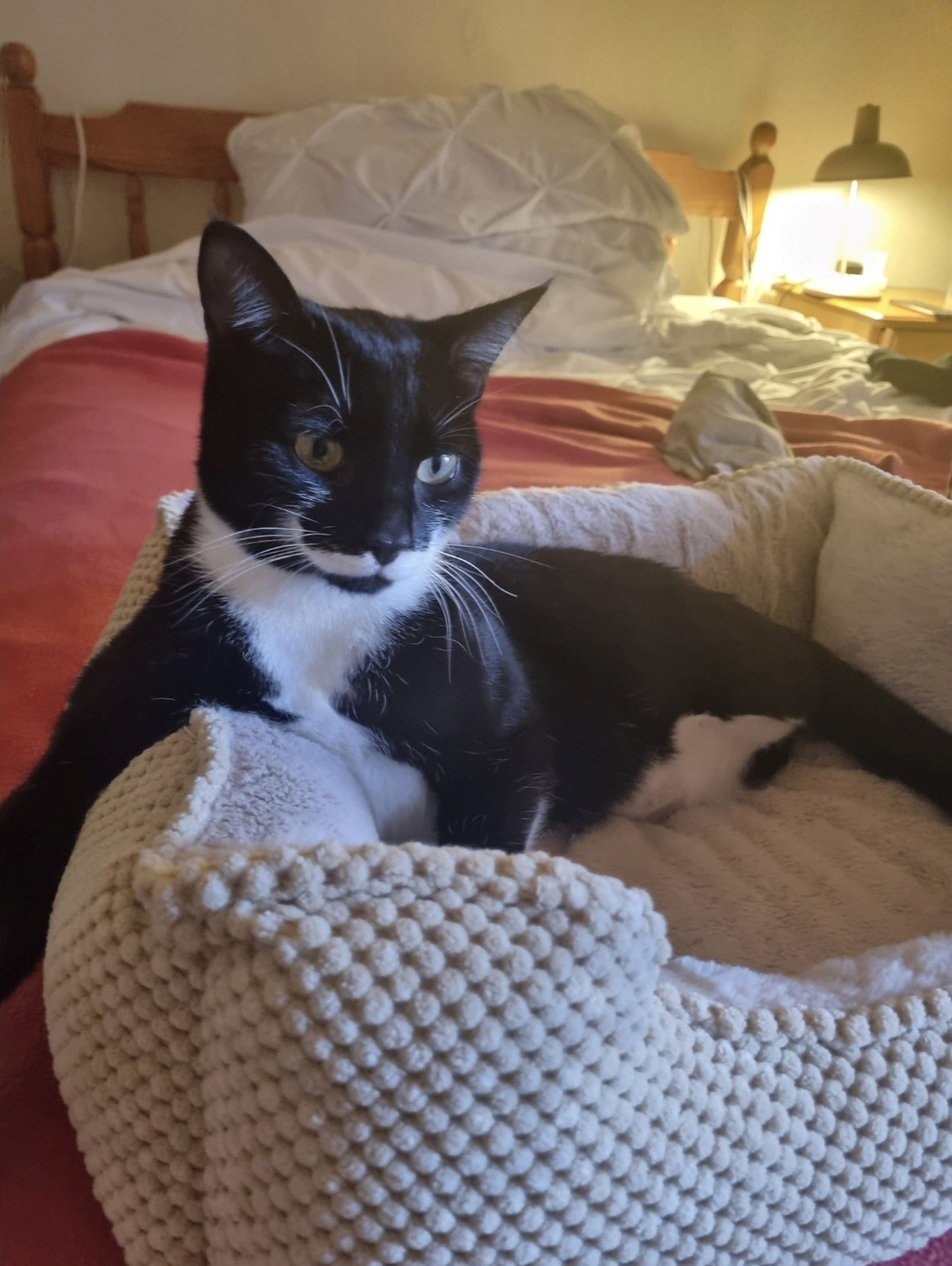 Pringle manages very well on her three legs but does benefit from small bits of help around the home. For example we place a box at the end of the bed which she uses as a step so she can comfortably get up, and she naturally chooses this route.
