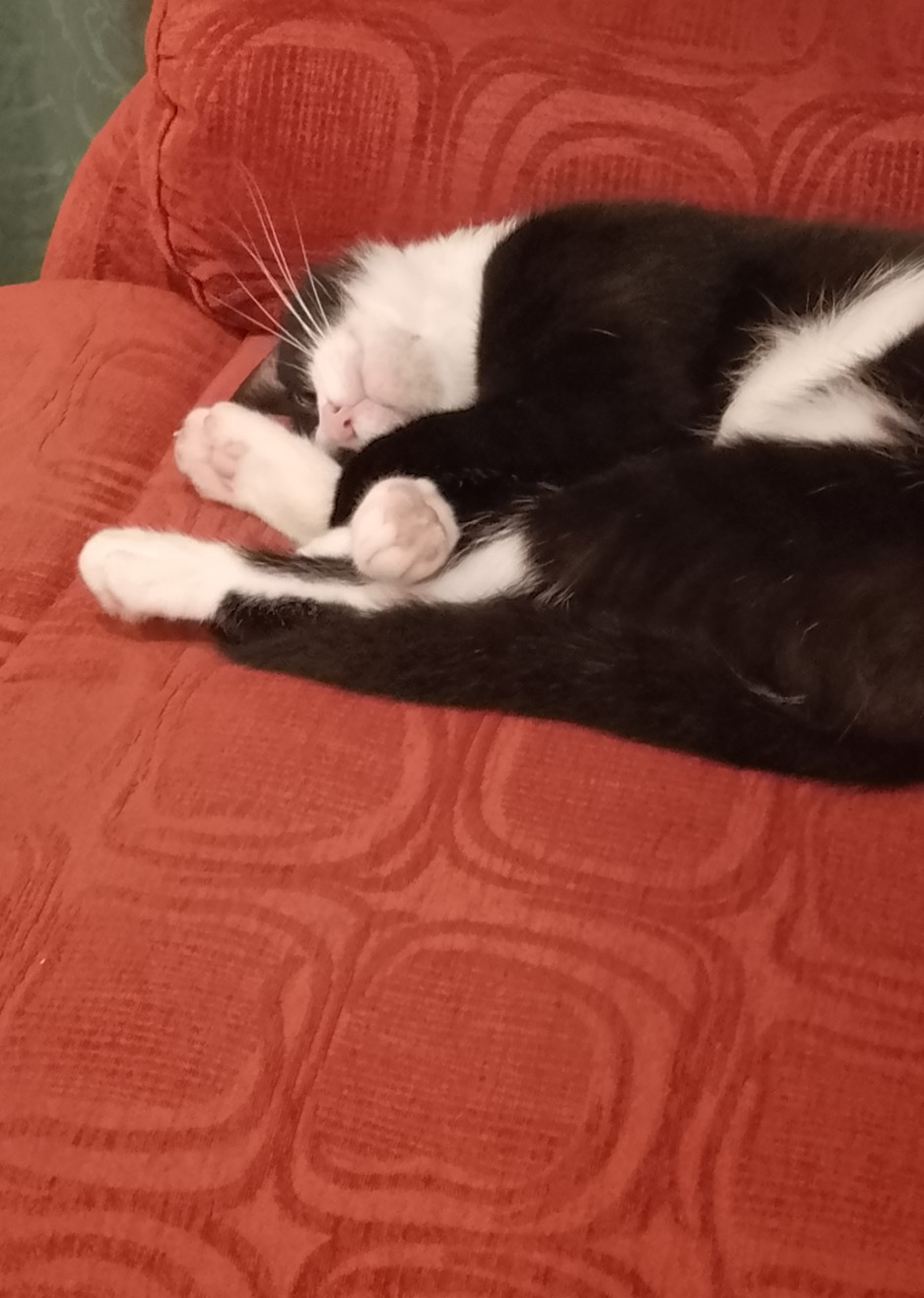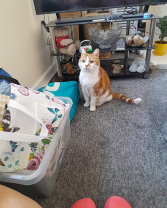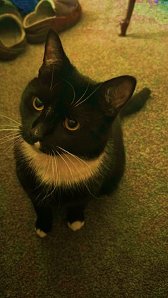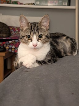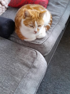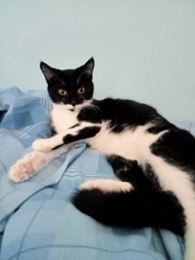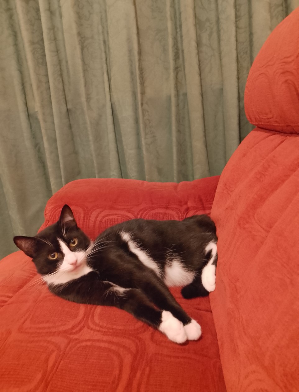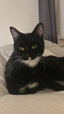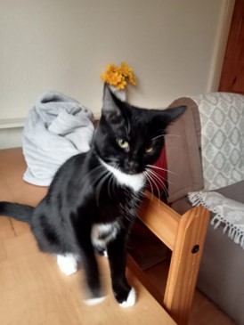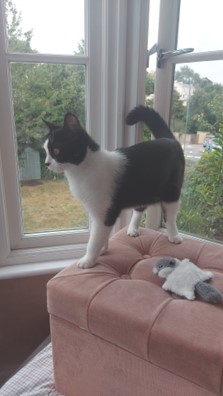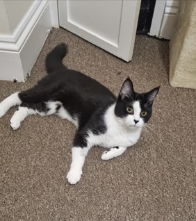 He has a very healthy appetite and loves his food. He's vocal when hungry and could win a competition for his long meow! He'd benefit from a forever home with a garden. Considering his tricky start, he is very good natured and is a lovely pet. He is well behaved and good around the house. He likes bopping pencils around the carpet to play. He snuggles up on the sofa next to us but isn't a lap cat. He likes his own space but also enjoys being stroked and purrs in appreciation. He likes to groom himself and look smart!