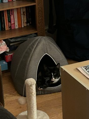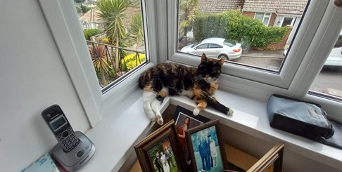 She was very shy and nervous when she first came to us and spent a lot of time hiding but she's gradually coming out of her shell. When she first arrived she would squeeze into very tight places to hide so she needs a very secure home with no gaps for her to potentially get stuck in. She doesn't try to do this now she's more confident. She needs a quiet, relaxed household with someone that can give her plenty of attention so she can feel safe to show her lovely personality. No other cats, dogs or children. She's super playful and has a toy that hangs from the door frame that she likes to repeatedly grab in her mouth, stretching the elastic to the maximum then she let's go so it flies up in the air bouncing around. She also has a favourite pink fish toy that she will pick up and move around the house. Sometimes when we wake up and she's brought a toy to our bed in the night and left it there. She's particularly happy when we first wake and sprints around the flat full of joy and energy. She's a very good girl though and only uses her scratching post to scratch and never plays with anything but her toys. So far she's not a cuddly lap cat but she's been coming onto our beds to sleep some of the time. We think given time this will progress to her becoming very affectionate. When she's in the mood for being petted she will come and lie down close to us and purrs very loudly but currently she doesn't cuddle up for long periods. She has the cutest, smallest little meow when she wants to play or she sees we are about to give her a treat. She's just such an adorable little thing it's impossible not to fall in love with her beautiful little face and heart shaped black nose. We hope she can find a home where she can settle in for good so her lovely, gentle, playful little character can continue to develop as she grows into adulthood.