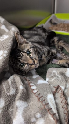 Susie (all tabby) is a lovely girl who loves a fuss. Quite a purrer when she gets going! Spends a lot of time with her sister Sasha. Most the time they are curled up together or wrestling and chasing each other!